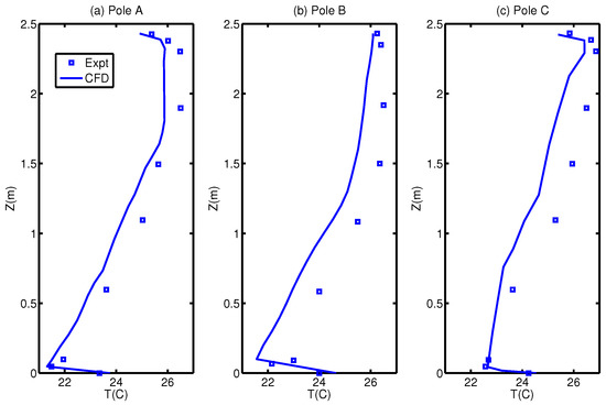 Temperature comparisons between the CFD results and experimental data at: (a) Pole A; (b) Pole B; and (c) Pole C.