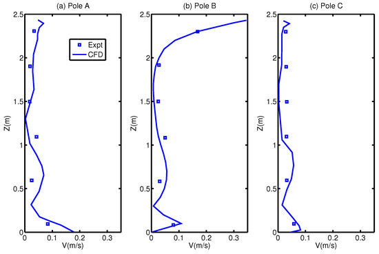 Velocity comparisons between the CFD results and experimental data at: (a) Pole A; (b) Pole B; and (c) Pole C.