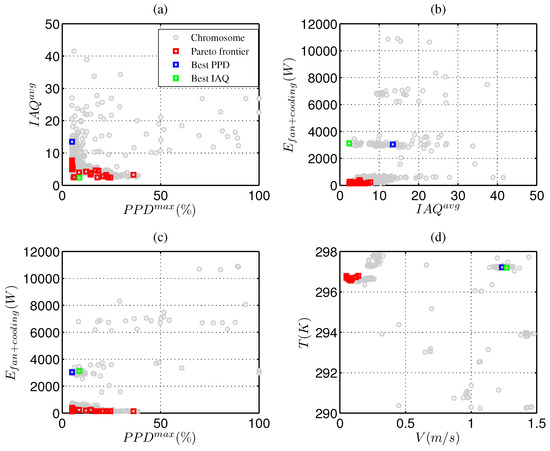 From Figure 8d, it is shown that 25 pairs of control variables are clustered in two groups. In the two 2D projections of objective space (IAQ–Energy and PPD–Energy graphs), the cluster effect is also easily identified. By quantitative analysis of the two clusters, the group containing most solutions (23/25) has energy consumption lower than 500 W. The other group containing two solutions (marked with green and blue colors in Figure 8) has much higher energy consumption beyond . However, the green one represents the best solution that acquires the optimal IAQ level (minimum of : 2.40) and the blue one reaches the optimal thermal comfort (minimum of PPD: 5.00). This means that when thermal and IAQ optimization are coupled with energy consumption optimization, the optimal option is not simple to obtain.