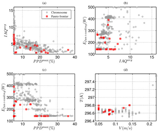 If we limit the energy consumption below 500 W and redraw the figure (Figure 9), 23 solutions remain in the Pareto front with more clear distribution shapes. Theoretically, the set of all variables on the Pareto front are solutions of the multi-objective optimization problem. The outcomes of this specific limitation show that most optimal control variables can reach values of lower than 400 W, less than 25% (12 solutions less than 10%) and less than 10, simultaneously. At the same time, from Figure 9d we can find that most of the optimal air speeds of the diffuser are between 0.05 m/s and 0.1 m/s , and the optimal temperate is between 296.5 K and 297 K. The control variables that fell into above ranges are consistent with the American Society of Heating Refrigerating and Air conditioning Engineer (ASHRAE) standard’s recommendation [24,27]. It is noted that, in practice, both flow rate and supply temperature are connected to meeting the load and are constrained by temperature gradient condition and stratification height condition, which are ignored in this optimization study.