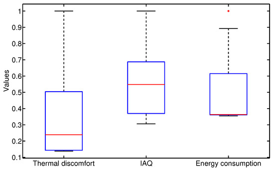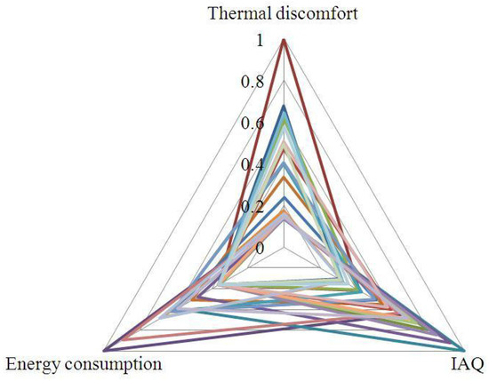 In order to derive the emphasis of different solutions, each building index belonging to the 3D Pareto front is represented on a radar diagram (Figure 10). To ensure that no special axis is dominant over the others, all types of indexes are normalized to the interval (0, 1) by a simple linear scaling function: . The distributions of the building indexes are also represented in boxplots (Figure 11). As discussed above, the variations of the index of energy consumption () are quite limited. Almost half are clustered at the bottom of the box (near 140 W). Such results show that by satisfying the used PMV and IAQ indexes, the HVAC system’s energy conservation still has the potential if the occupied zone’s environmental parameters can be precisely fed back by sensors.