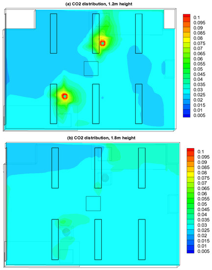Resulted CO fraction distribution at: (a) sitting height (1.2 m ); and (b) standing height (1.8 m).