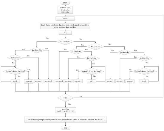 Flow chart of establishing the joint probability table of sectionalized wind speed of two wind turbines A1 and A2.