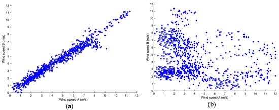 Scatter diagrams of paired wind speed values: (a) linear correlation of wind speed A and B; (b) nonlinear correlation or no-correlation of wind speed A and B.