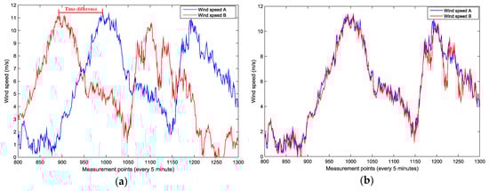 Wind speeds series in time of wind turbine A and B in a certain period: (a) before shifting the time difference; (b) after shifting the time difference.