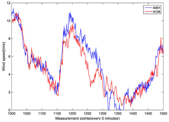 As each wind turbine is at a distance ranging from 200 m to 10 km from others in the Qiaodong II wind farm, the wind speed of each wind turbine may vary differently due to the distance. To analyze the temporal-geographical correlation of wind speed between wind turbines, the wind speeds in time series of two wind turbines in a certain period were treated by shifting several time intervals from the wind speed series of wind turbine A001 and keeping that of A134 unchanged. The Pearson coefficient, which tests the correlation of the two treated wind speed series, was then calculated to examine the distance relationship between A001 and A134. The original measured wind speed series of A001 and A134 in a certain period is shown in Figure 8, which describes a time difference between two wind speeds series.