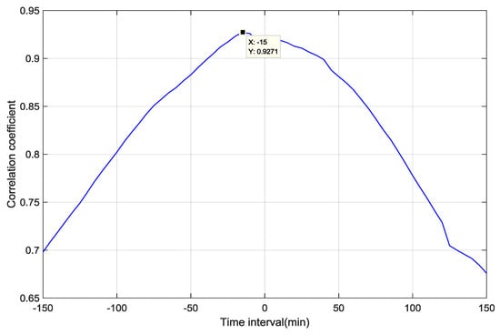 Then the Pearson coefficients were calculated in different shifted time intervals. Figure 9 depicts the variation of correlation coefficient values corresponding to different shifted intervals. The shifted time of A001 wind speed series ranges from −150 min to +150 min. Note that “–“ means the shifted wind speed series of A001 is lagging behind that of A134 while “+” means the shifted series of A001 is ahead of that of A134. The peak value of the Pearson coefficient is reached at 0.9271 when the time intervals of A001 are shifted backward by 15 min, which means that the two have a strong correlation after time shifting. The time difference “15 min” can be intuitively explained by their geographical distance. Indeed, the distance where the wind at a mean speed (5 m/s) goes from A134 to A001 lasting for 15 min is exactly examined to be their actual distance (4–5 km), which indicates A134 was upstream of A001 during that period.
