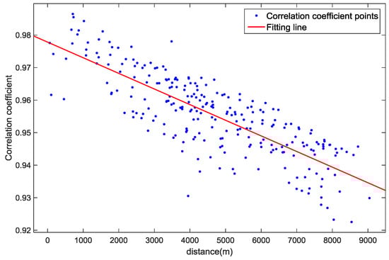 Wind speeds of 134 wind turbines for one year in the Qiaodong II wind farm were treated by calculating the correlation coefficients between any two turbines. Figure 10 describes a downtrend of correlation coefficient values as the distance of two corresponding turbines is increasing. It is observed that there is a strong correlation between any two wind turbines in the same wind farm shown in Figure 10, where all the correlation coefficients are higher than 0.9 even if the furthest distance is 9 km. By linear fitting, the linear relationship between the Pearson coefficients and geographical distance is as follows: