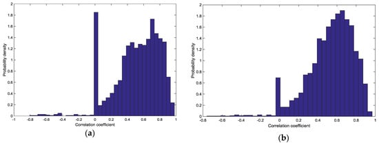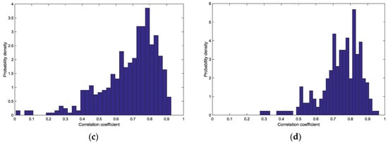 As one of results among cases, the correlation coefficient between wind farm Qiaodong II and wind turbine A015 was calculated. Consequently, its probability density distributions were obtained as seen in Figure 11, where the coefficient value “−1” means a negative correlation between the wind speed series of the wind farm and wind turbine A015 while the value “1” indicates a positive correlation between the two. Note that the overall blue area of each subplot is 1, which is the total probability of the correlation coefficient in the specific time interval. It is observed that the Pearson coefficients for short time scales (subplot (a) and (b)) range from −1 to 1 while those of long time scales (subplot (c) and (d)) range from 0 to 1.