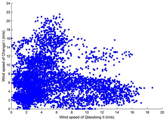 Wind speed series in the Qiaodong II and Changxi I wind farms were analyzed as an example to investigate the correlation characteristics of wind speed among wind farms. At a distance of 80 km, the wind speed of the two wind farms is not linearly correlated, which is shown in Figure 12 where wind speed points are scattered randomly and disorderly.