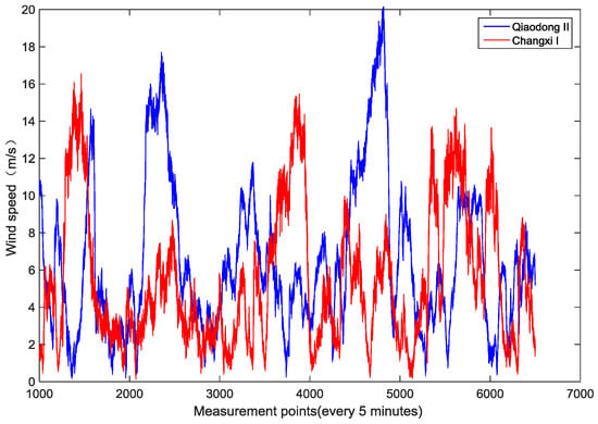 Wind speeds in time series of the Qiaodong II and Changxi I wind farms in a certain period.
