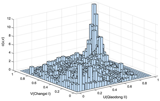 An asymmetric tail is shown in Figure 14 with a heavy upper tail and a light lower tail. After constructing the empirical Copula function, the Euclidean distances of common Copulas (Gauss, t, Gumbel, etc.) to the empirical Copula are calculated, respectively, to determine the best-fitted Copula function. The less the Euclidean distance of the specific Copula function to the empirical copula distribution is, the better the Copula function fits the actual joint distribution. As the results in Table 4 show, the Gumbel_Copula with its minimum Euclidean distance to the empirical Copula fits the best compared to other common copulas. Therefore, the Gumbel_Copula was chosen as the fitted-best copula to analyze the correlation of wind speed series between the Qiaodong II and Changxi I wind farms.
