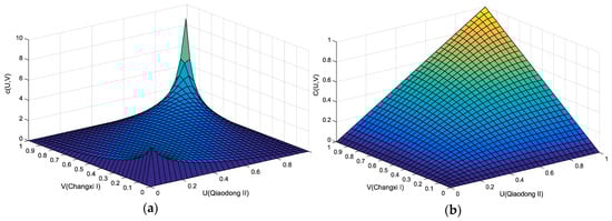 Gumbel-Copula function based on wind speeds of Qiaodong II and Changxi I: (a) Gumbel-Copula probability density function; (b) Gumbel-Copula cumulative function.
