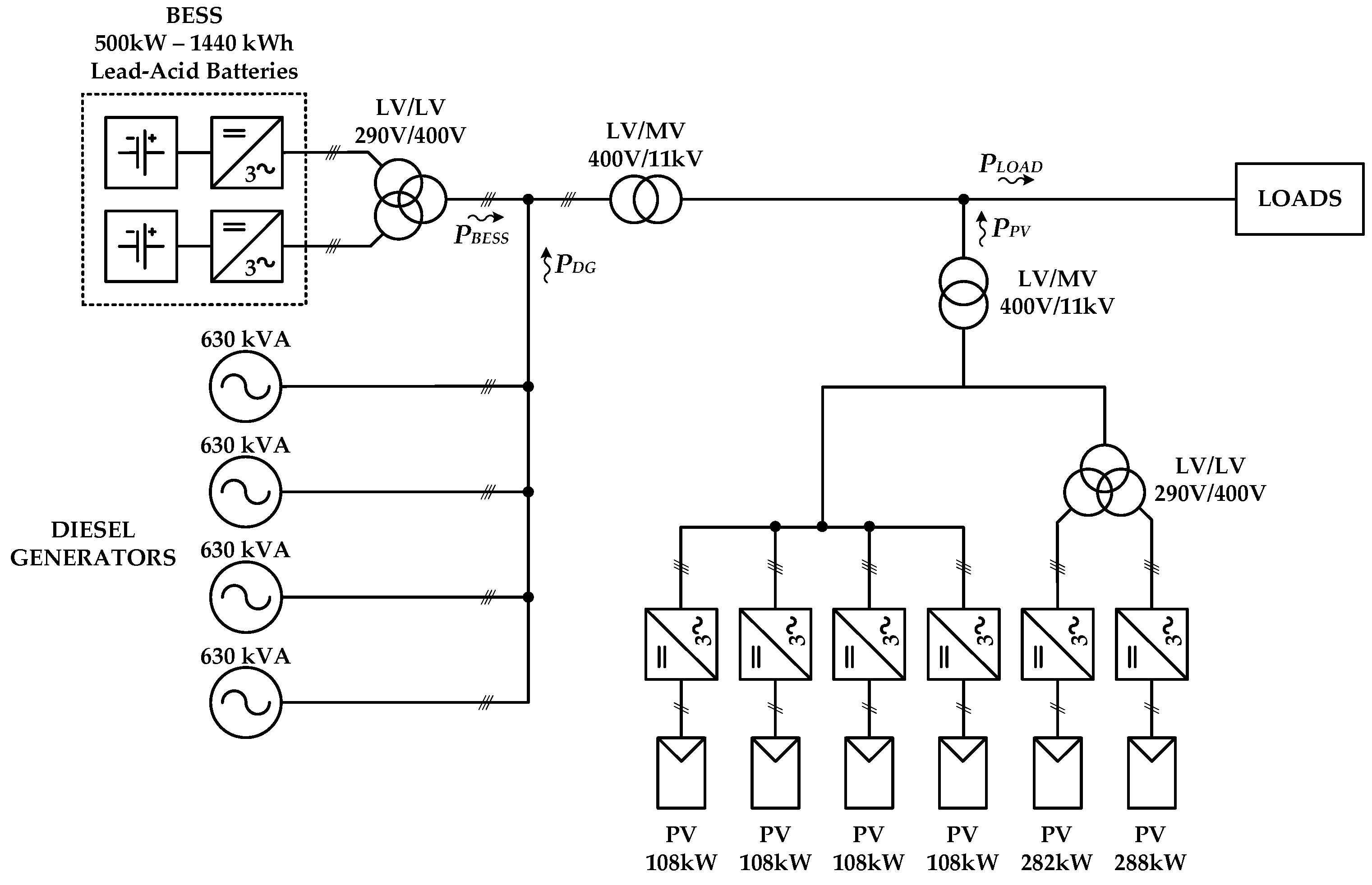 The electrical system also includes a 2 × 250 kW–2 × 720 kWh BESS, made of two battery banks for a total of 600 lead-acid batteries; each battery is characterized by a rated voltage of 2 V and a rated capacity of 1200 Ah. Each battery bank is connected to the grid through a DC/AC 250 kVA bidirectional inverter. The main function of the BESS is the improvement of the stability of the power plant, with the aim of increasing the exploitation of RES, thereby leading to a substantial fuel economy compared to the solution with only DGs. The plant is designed to supply the city of Garowe through three overhead distribution lines, operating in medium voltage (11 kV, 50 Hz). Since the micro-grid is located in a rural area of Africa, the load is mainly domestic and related to lighting, thus concentrated in the evening hours. Figure 1 shows the diagram of the micro-grid described above.