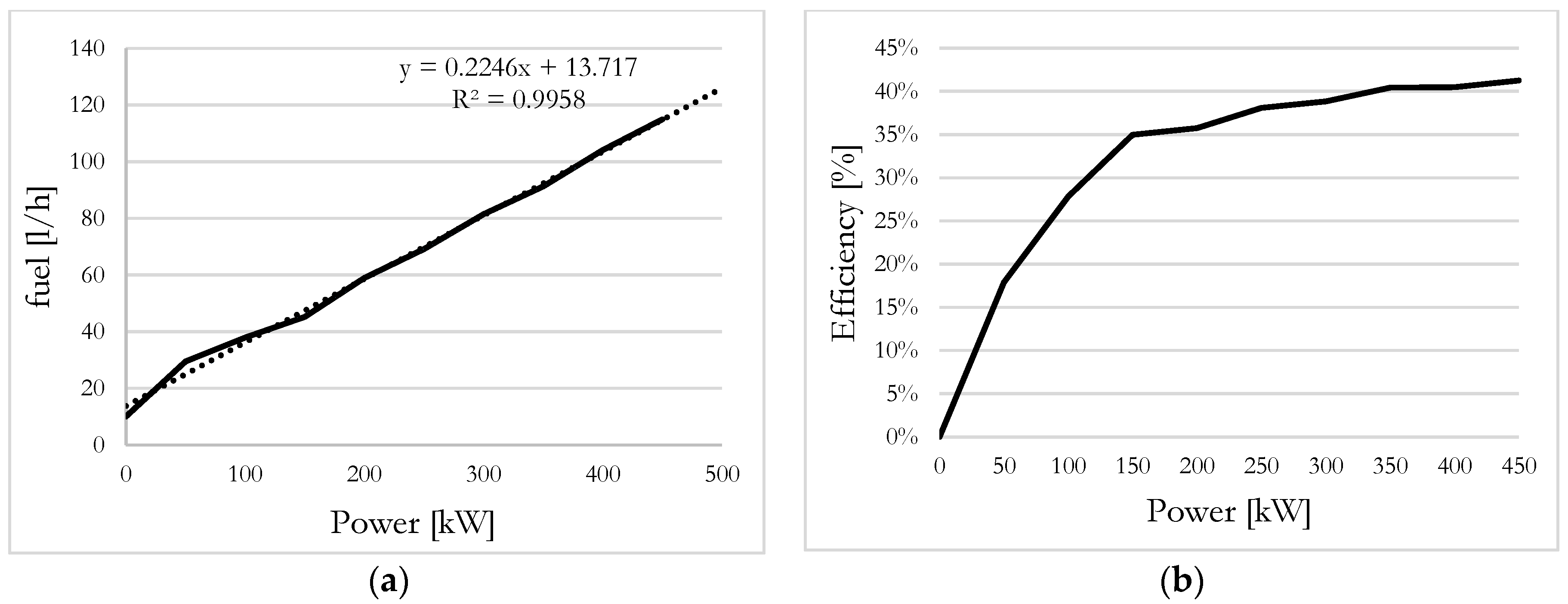 By having collected the fuel consumption rates for different power levels of diesel generators, having assumed 40.9 MJ/kg of diesel heating value and 835 kg/m3 for diesel density, it has been possible to calculate the input power for DGs and the corresponding efficiency (Figure 2b).