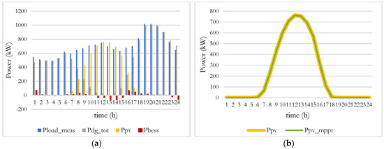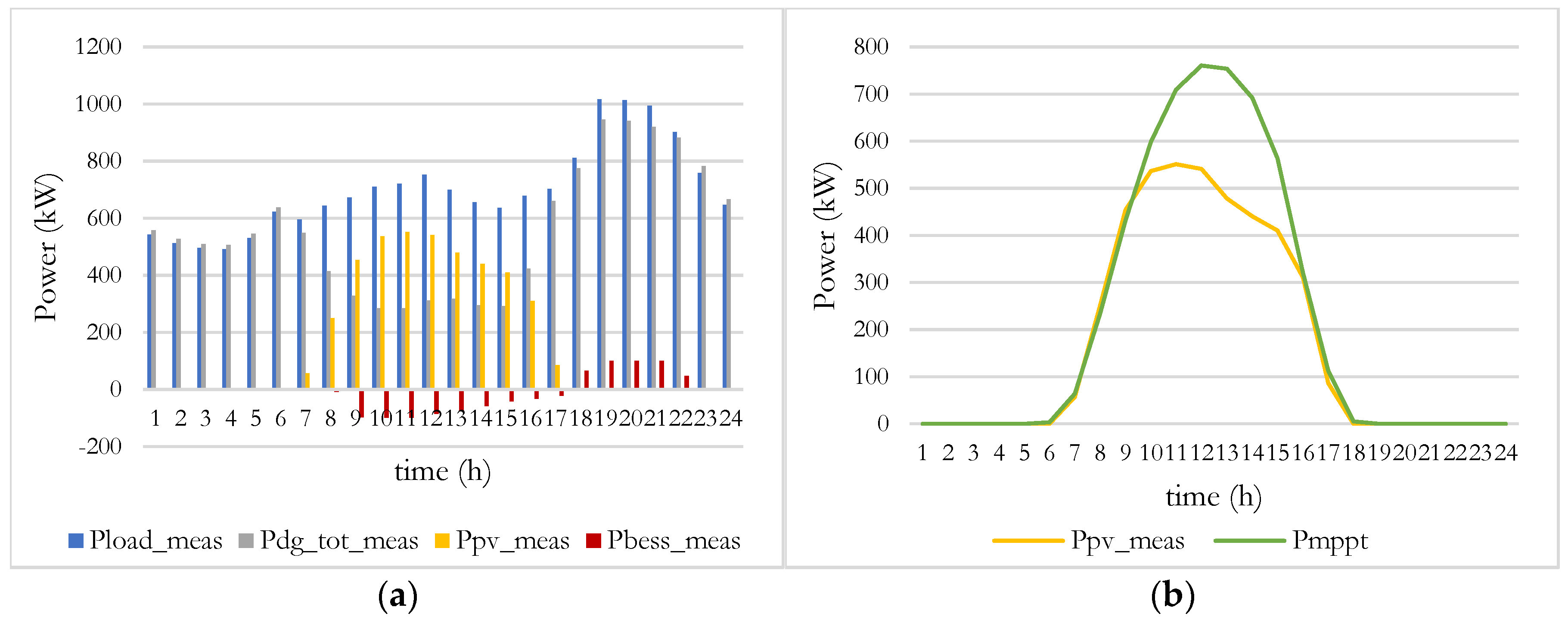Figure 3a shows the main power flows into the micro-grid case study managed by the actual control logic in terms of power absorbed by the load (Pload_meas), overall power produced by DGs (P_dg_tot_meas), power produced by the PV system (Ppv_meas) and power absorbed (negative values) or generated (positive values) by BESS (Pbess_meas). Figure 3b shows the comparison between the measured PV power (Ppv_meas) and the maximum harvestable power (Pmppt): it is evident that actual power has not reached the maximum possible (for the irradiance conditions of the day analyzed), but it has been curtailed in the central hours of the day.