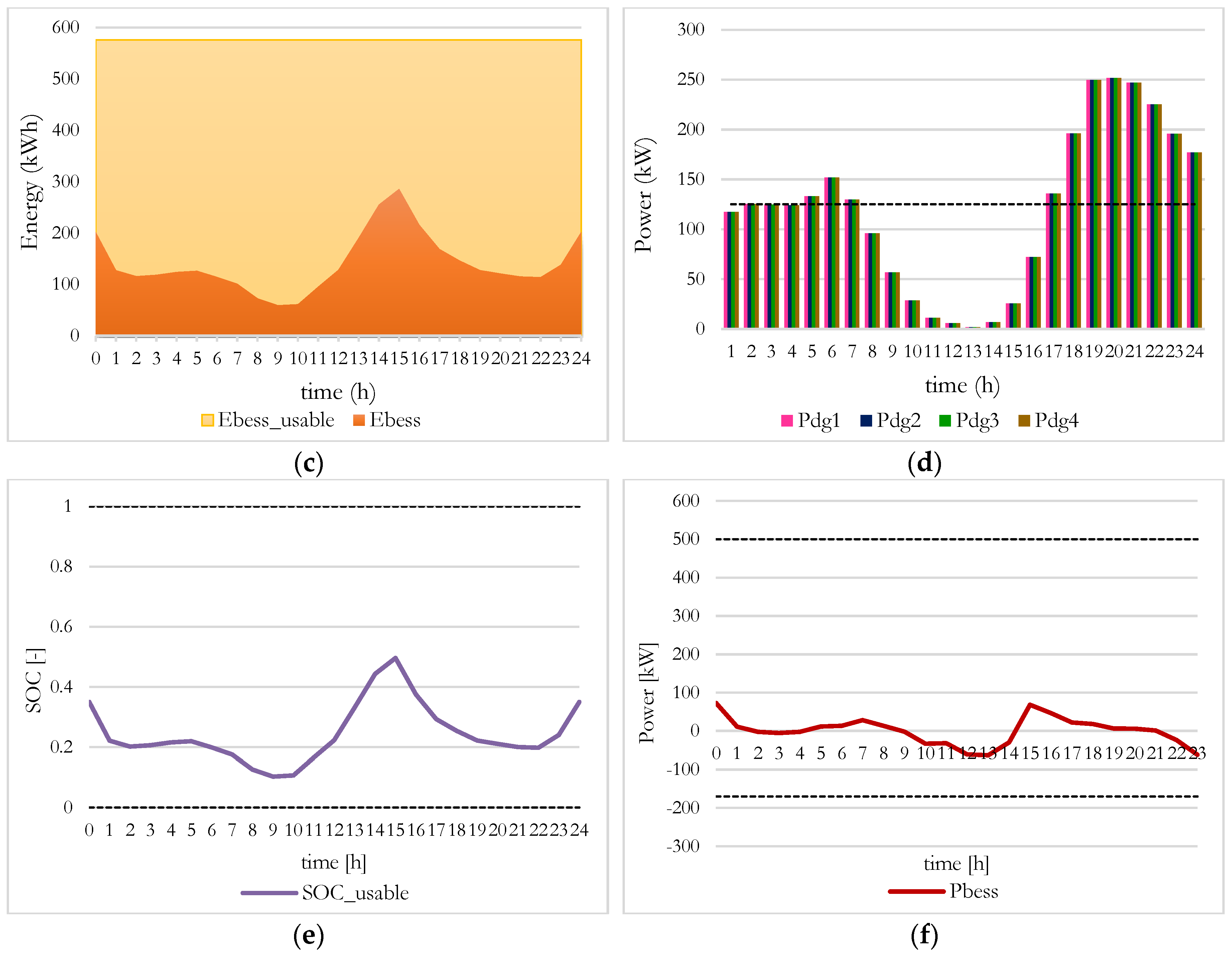 - Objective function: since the main purpose of this optimization is to harvest as much of the renewable energy as possible, the objective function of the model has been set as the minimization of the energy production by the DGs, in the time interval considered (T = 24 h).