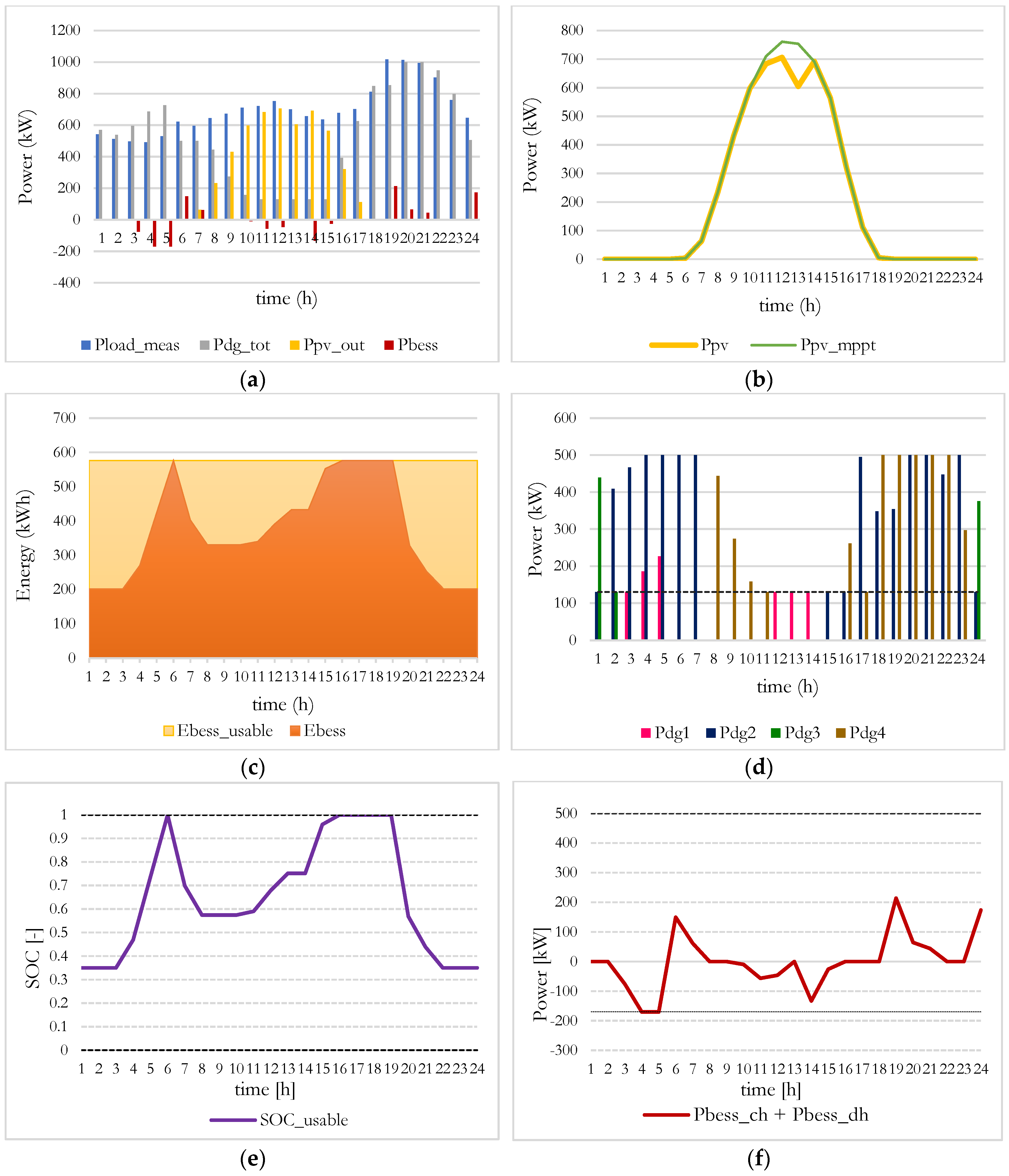At first, the use of PV power in the optimization model has been analyzed: as it can be noticed by Figure 4, the output PV power of the optimization model exactly corresponds to the MPPT power; thus, the model allows PV plant to produce the maximum available power.