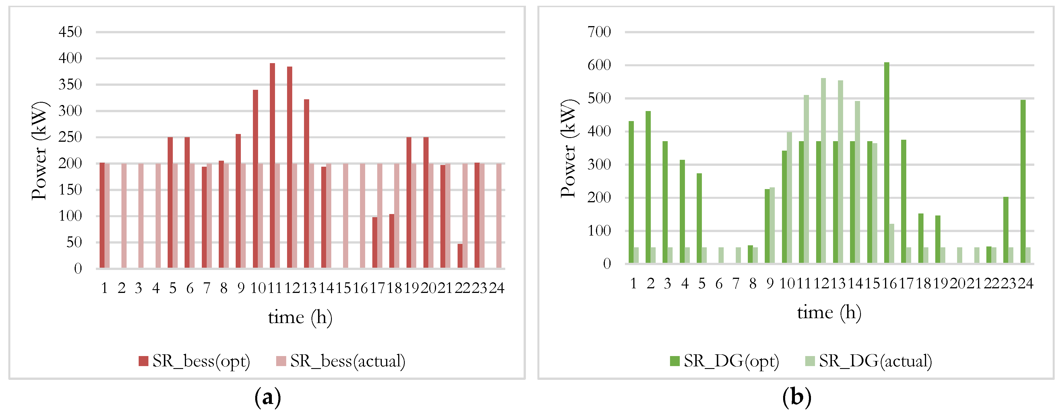 Therefore, the amount of spinning reserve allocated to the DGs in the middle of day decreases (Figure 6b). In this way, the number of DGs working at the same time can be lower than in the actual management, since the total quantity of spinning reserve they have to provide has been reduced, so that just one or two DGs can contribute to it. During the night, the spinning reserve of DGs is greater than in the actual control logic, thus it is not expected to have a strong impact on the number of DGs that are running. In fact, during the night, the load is almost completely covered by DGs (just a little portion by BESS), so that, even if spinning reserve decreases, the number of running DGs cannot be reduced, otherwise load cannot be supplied. As a result, the total daily energy produced by DGs is reduced by 5.8% with respect to the measured value of the case study micro-grid.