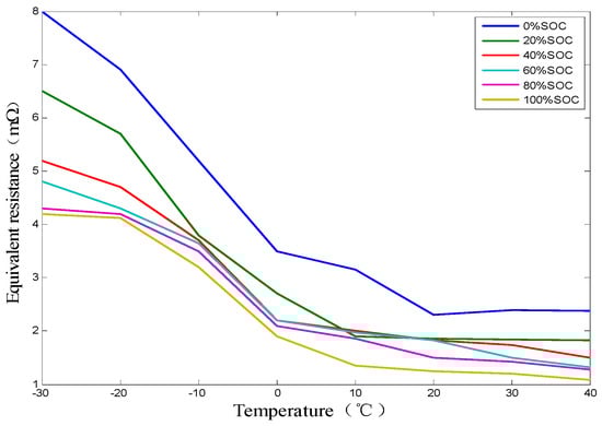 Equivalent resistance  is SOC and temperature dependent, and it is measured by experiments using a hybrid pulse power characterization (HPPC) method. The detailed measurement procedures can be found in []. Test results are shown in Figure 3. According to Figure 3, the value of  under specific SOC and temperature could be acquired through a look-up table.