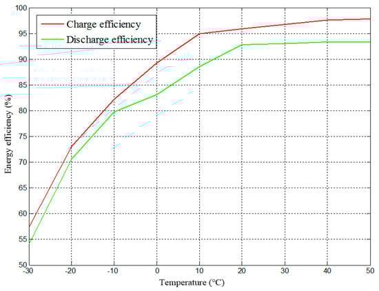 Energy efficiency  is another parameter that is greatly influenced by temperature [].  is divided into discharge efficiency and charge efficiency. The expressions of discharge efficiency and charge efficiency are shown in Equations (1) and (2), respectively: