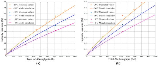 Equations (14) and (15) are adopted as the battery aging model in our simulation process. Experiments are conducted to validate these two equations. In the experiments, the SOC region is 20%~100%; the temperatures of the thermostatic chamber are set as −20 °C, −10 °C and 0 °C to verify the accuracy of the aging model at subzero temperatures in particular; current rates of 1C and 2C are chosen, respectively, since they are commonly used as standard rates []. The test results are shown in Figure 6, where it can be seen that the measured values are very close to the model simulation values. Thus the proposed battery degradation model is capable of presenting the capacity loss character of the battery used in this paper.