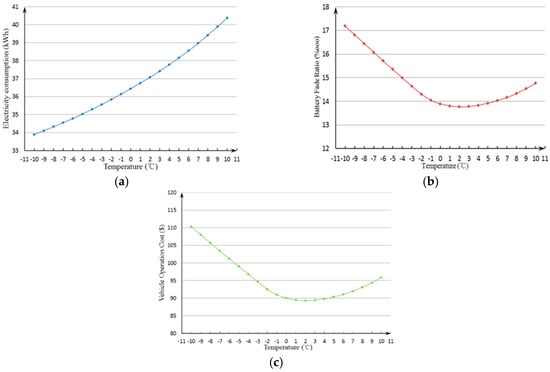 For example, assuming that  is −10 °C; L is 20 km;  is 20% and then battery is fully charged to 100% SOC; after being charged, the vehicle operates according to Figure 9. The optimization results given by NSGA-II indicate that the optimal preheating target temperature is 2 °C, and the corresponding vehicle operation cost is 88.74 $ (electricity consumption cost and battery fade cost are 4.36 $ and 84.38 $, respectively). A 0.014% capacity loss is simultaneously observed, which may seem a little high compared to normal battery lifecycle. This is because the temperature and current rate of battery keep changing over a wide range in the driving cycle, which accelerates battery degradation compared with a constant current rate and appropriate temperature conditions. Another reason is that the battery has a faster degradation rate at the beginning of battery usage because of the special mechanism of Li plating []. The optimization results mean that if the battery were preheated to 2 °C before battery charging and vehicle operation, the vehicle could achieve the least cost. In order to further validate this, the electricity consumption, battery fade ratio and vehicle operation cost at different preheating target temperatures are calculated and the results are shown in Figure 10. It is clearly shown in Figure 10a that the electricity consumption grows with increasing preheating temperatures, which means that although preheating could improve the energy efficiency of the battery, the preheating process would consume far more electricity than it can save inside the battery. Figure 10b shows that there is an optimal preheating temperature at which the battery degradation could be minimal. This is because at both too high and too low temperatures, the battery always suffers severe degradation, so in terms of reducing the capacity loss, the battery would better work at intermediate temperatures. Figure 10c gives the optimal preheating target temperatures from the point of view of comprehensive consideration of electricity consumption and battery fade. From a comprehensive comparison of these three figures, it can also be seen that the determination of the optimal preheating target temperature mainly depends on the battery fade factor, rather than electricty consumption.