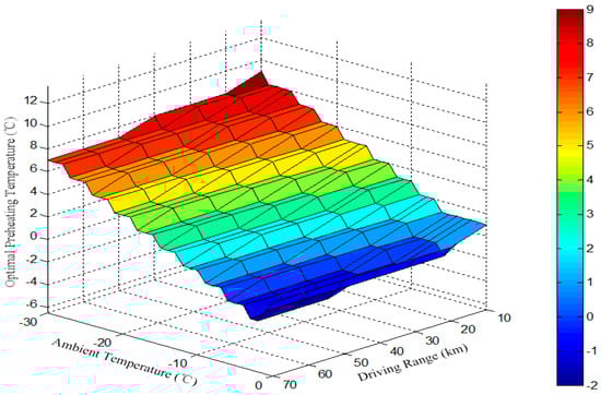 By using NSGA-II, every optimal preheating target temperature at different ambient temperatures and driving ranges are worked out. Based on these data, Figure 11 is plotted to present the optimal relationship between driving ranges, ambient temperatures and preheating target temperatures.