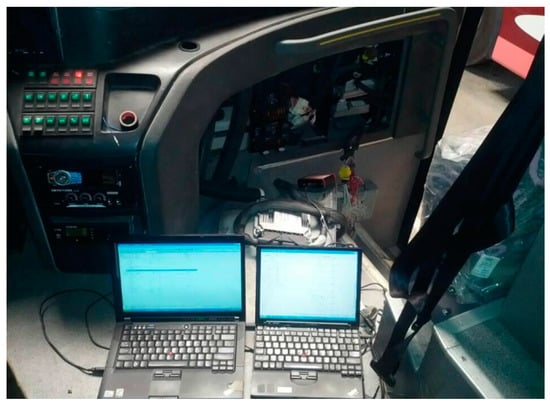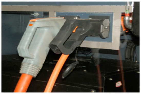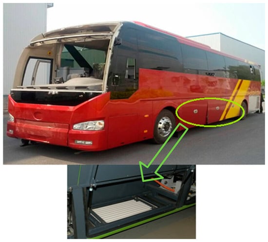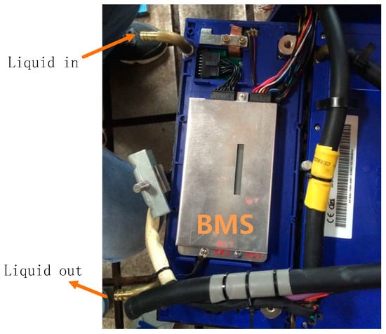 The liquid heating method was selected to implement battery preheating. Compared to other heating methods, liquids provide better thermal conductivity and higher convective heat transfer rates []. Besides, another important reason is that there is a ready-made liquid cooling system on the electric bus used for cooling the battery in summer. From the perspectives of cost saving and minimum modification, it is advisable to adopt this way of preheating because only a minor modification to the original cooling system needs to be made []. Figure 12 shows the cell with circulating liquid inside. Figure 13 shows the structure of the modified preheating system. Compared to the original cooling system, the modified preheating system added three positive temperature coefficient (PTC) heaters and an external electric socket and disconnected the compressor, evaporators and condensers. The electric socket is used to connect a heating plug linking to the charging pile, so the charging pile could supply power to the heaters. Each heater, with a max power of 8 kW, is used to heat the heating medium (glycol-water mixture 2:3) in the cycle. The water circulation is driven by the pump, flowing and heating the battery. The electric bus and actual layout of the heating pipes in battery box is shown in Figure 14.
