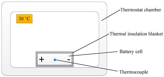 The main function of a battery thermal model is to obtain the heat generation () and temperature change () of the battery dynamically during vehicle operation. Heat generated by the battery during its working process could be divided into four parts []: reaction heat (), side reaction heat (), polarization reaction heat () and Joule heat (), as shown in Equation (5):