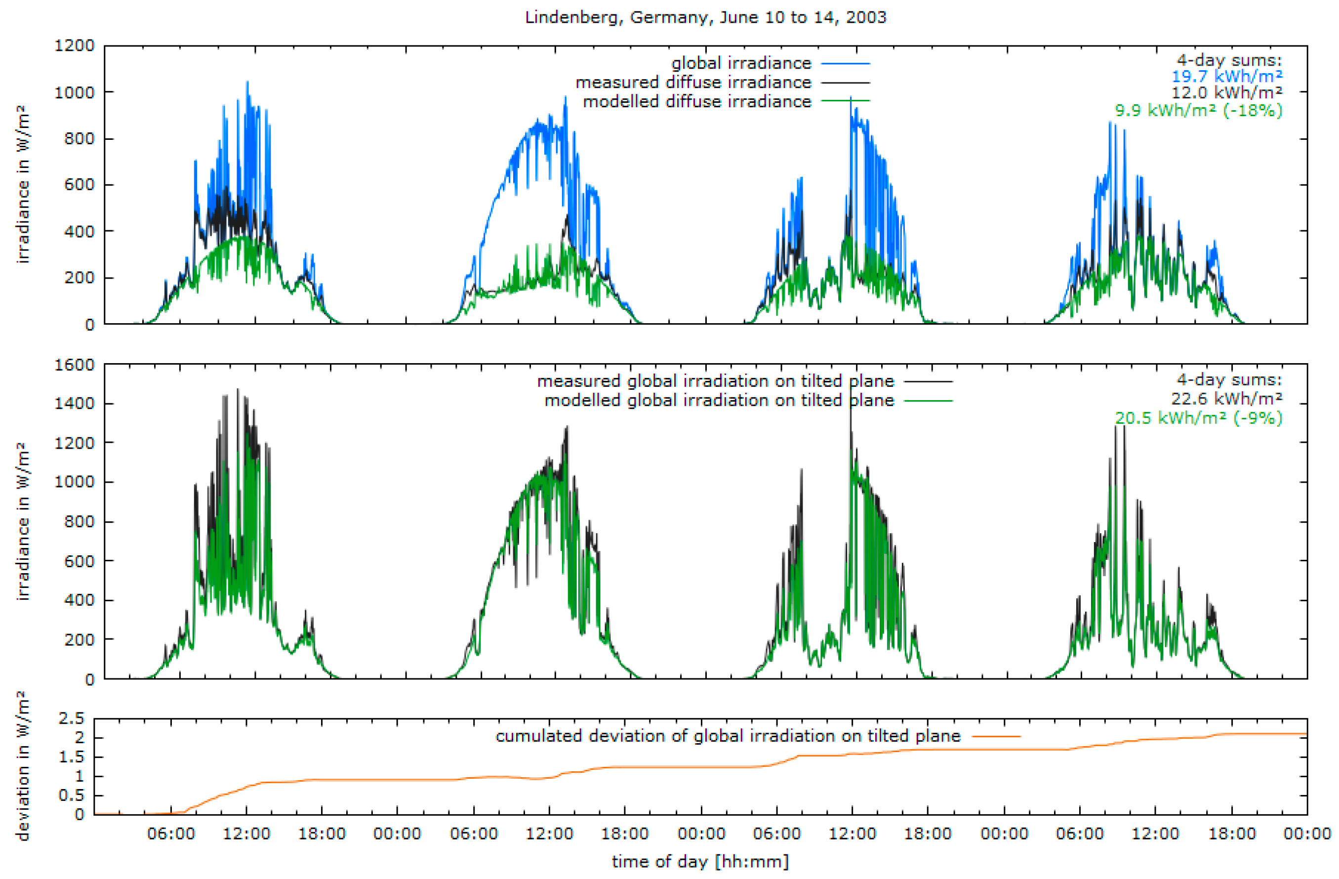 Top: Measured (grey) and modelled (green) time series of diffuse irradiance on a horizontal surface for four days in Lindenberg, Germany. Global irradiance (blue) for reference. The calculation of diffuse irradiance in this example was done with the reduced model of Reindl et al. [3]. The model underestimates the four-day sum of the diffuse irradiation by 18%. Middle: The global irradiance on a tilted photovoltaic (PV) module (facing south, tilted by 30°) for the same four days. The model used for calculating the irradiance on a tilted surface is from Hay and Davies [4]. Due to the underestimation of the diffuse irradiance (see top), the four-day sum of the global irradiation on the PV module based on modelled values falls below the global irradiation based on measured values by −9%. Bottom: The resulting cumulated deviation of the modelled global irradiation on the tilted plane from the measured. The plot shows that one of the main sources of deviation is the modelling of highly variable irradiance situations, as observed e.g., on 10 June, between 08:00 and 12:00.