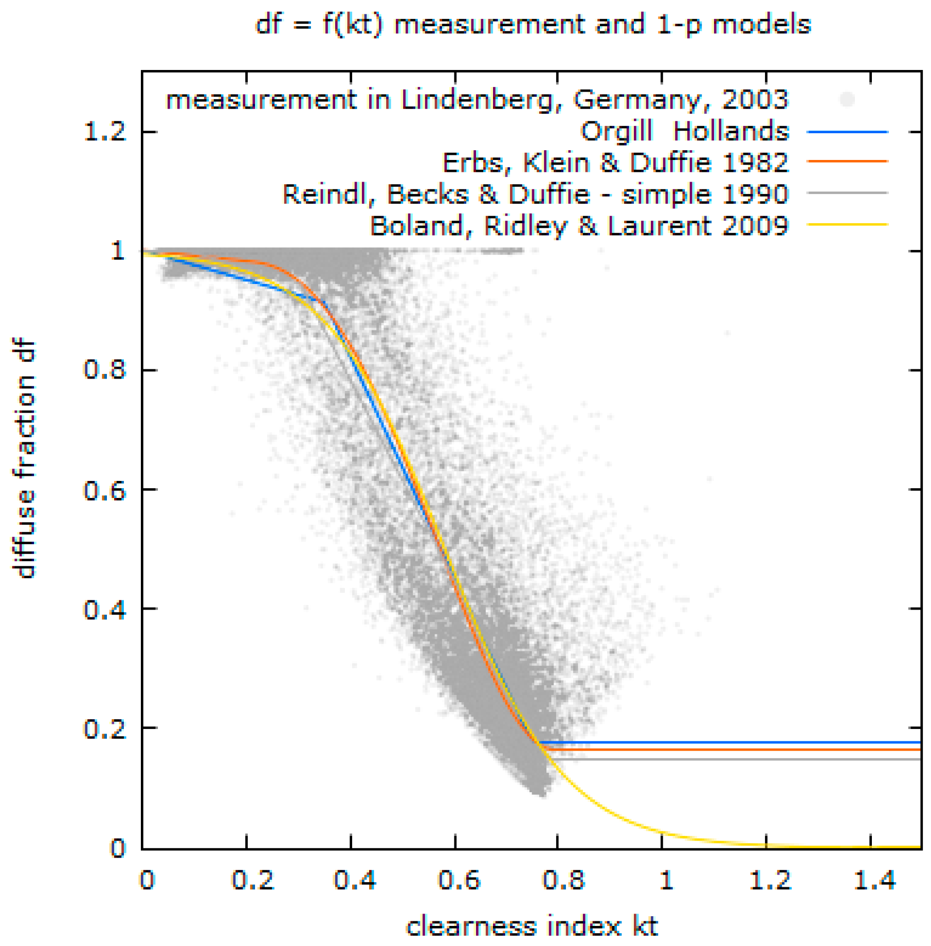 In consequence, other models were developed that can also be categorized as one-parameter models: Orgill and Hollands [18], Erbs, Klein and Duffie [19], Reindl, Beckman and Duffie [3] and Boland and Ridley [20]. A schematic overview of those models is provided in Figure 2, along with sample measurement data of Lindenberg, Germany, 2003, for reference. Other one-parameter approaches include the model by Oliveira et al. [21] that provides varying clearness index polynomials for three periods per year (December–January, April–August and September–March).