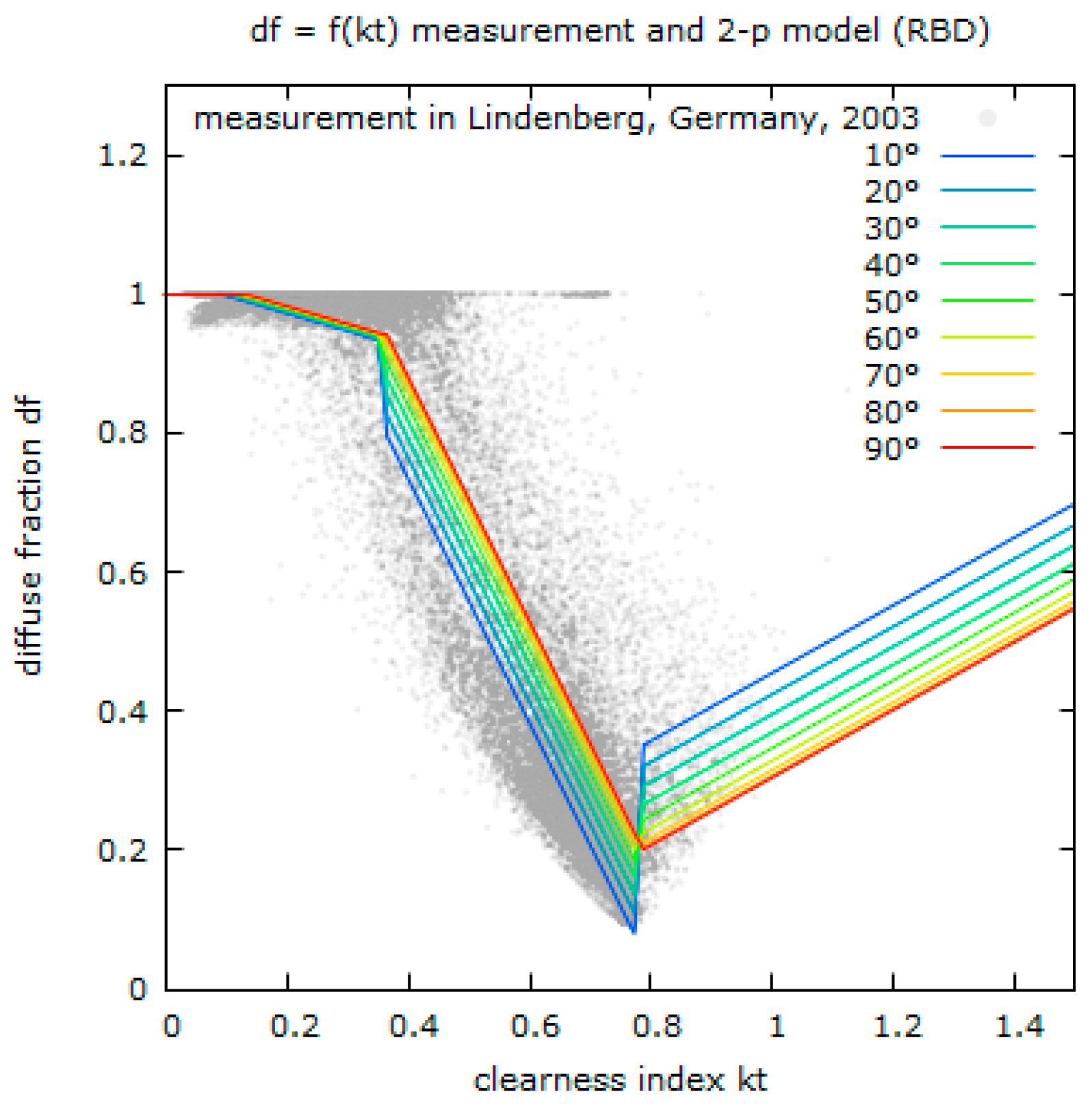 Measured diffuse fraction over clearness index for one year of measurement (grey points, extract of 2003) in Lindenberg, Germany. Line plots: The model by Reindl, Beckman and Duffie [3] (reduced version), using two parameters ( and sun height) as input.