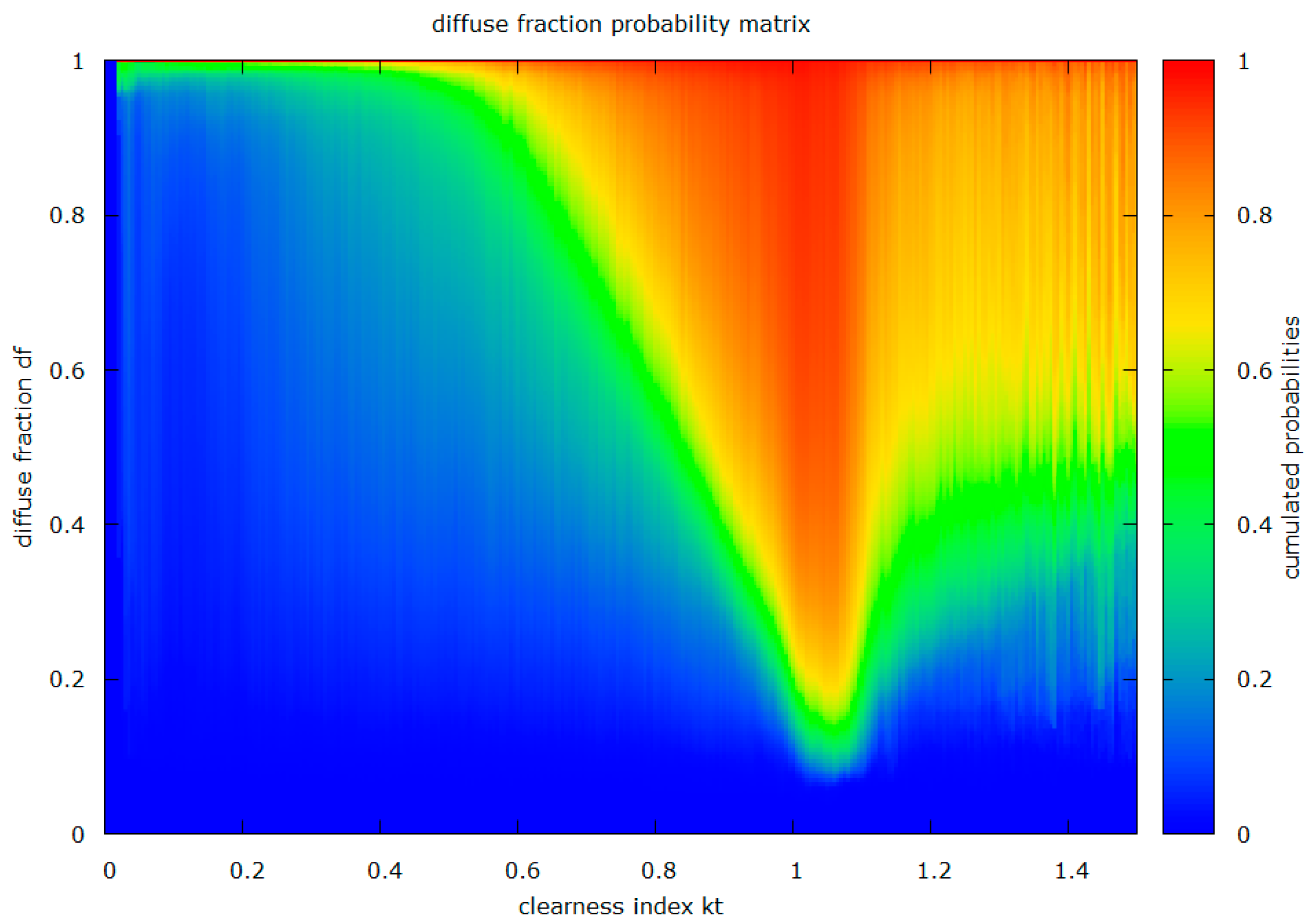 A probability matrix of the diffuse fraction as a function of the clearness index kt. For each value of , this matrix describes the probability with which a certain value of diffuse fraction will occur. The matrix correlates with the existing simple one-parameter models mentioned in Section 2.3, but it is based on measurements. Therefore the natural variability is better described by the model especially for high values of ( > 1.1, irradiance enhancement due to reflections by broken clouds) while preserving the strong relation at low levels of ( < 0.4, overcast sky).