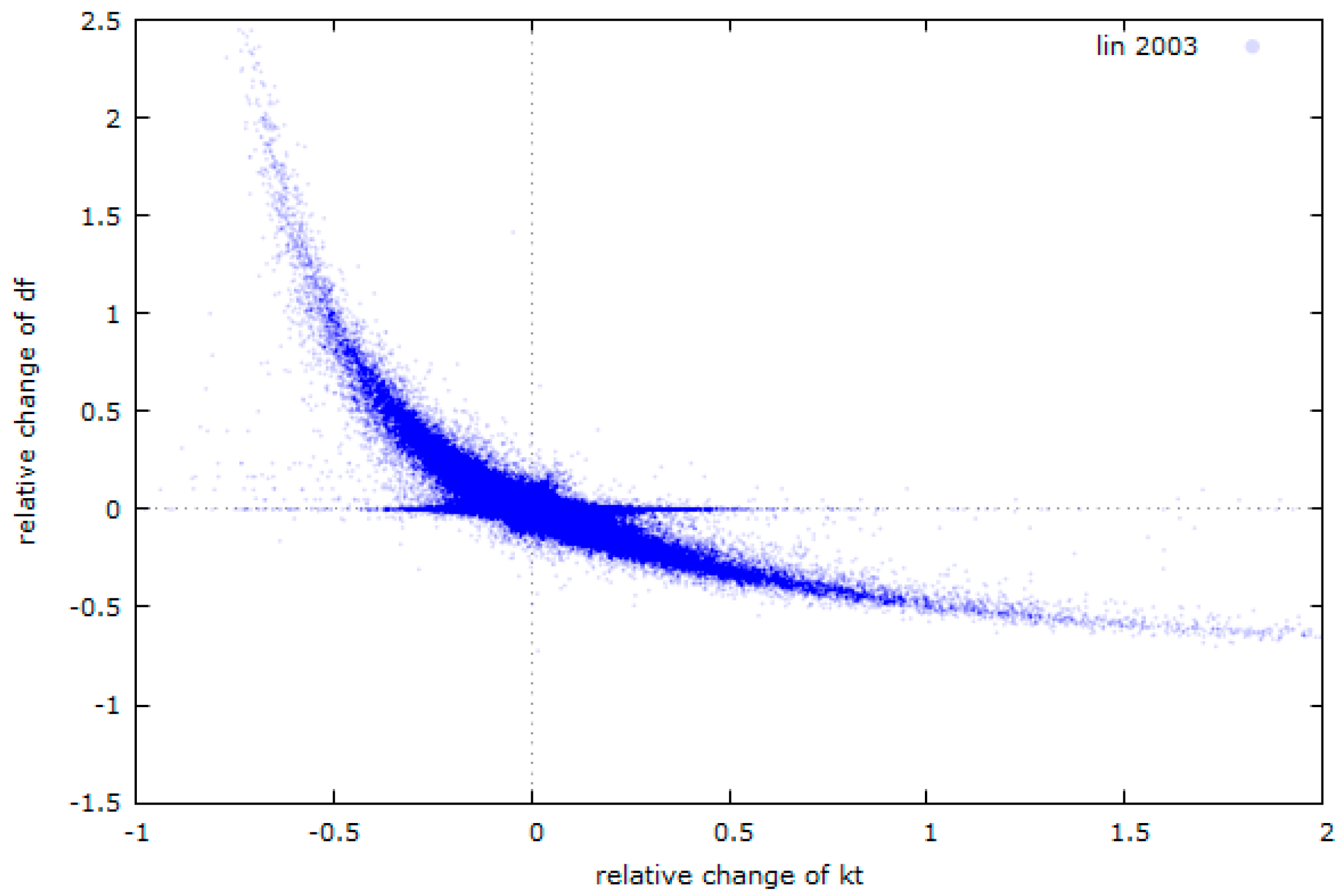 Scatter plot of the relative changes of the diffuse fraction over the relative changes of the clearness index for Lindenberg, Germany, 2003. This strong relation is very valuable for modelling a realistic behaviour of the diffuse fraction over the day, since it depends highly on the behaviour of . The area where the change of df is 0 while kt shows relatives changes between −0.5 and 0.5, i.e., is changing while is not, indicates days with movement of broken clouds, the reflection on which couses the measured global irradiance to change rapidly without changing its diffuse fraction.