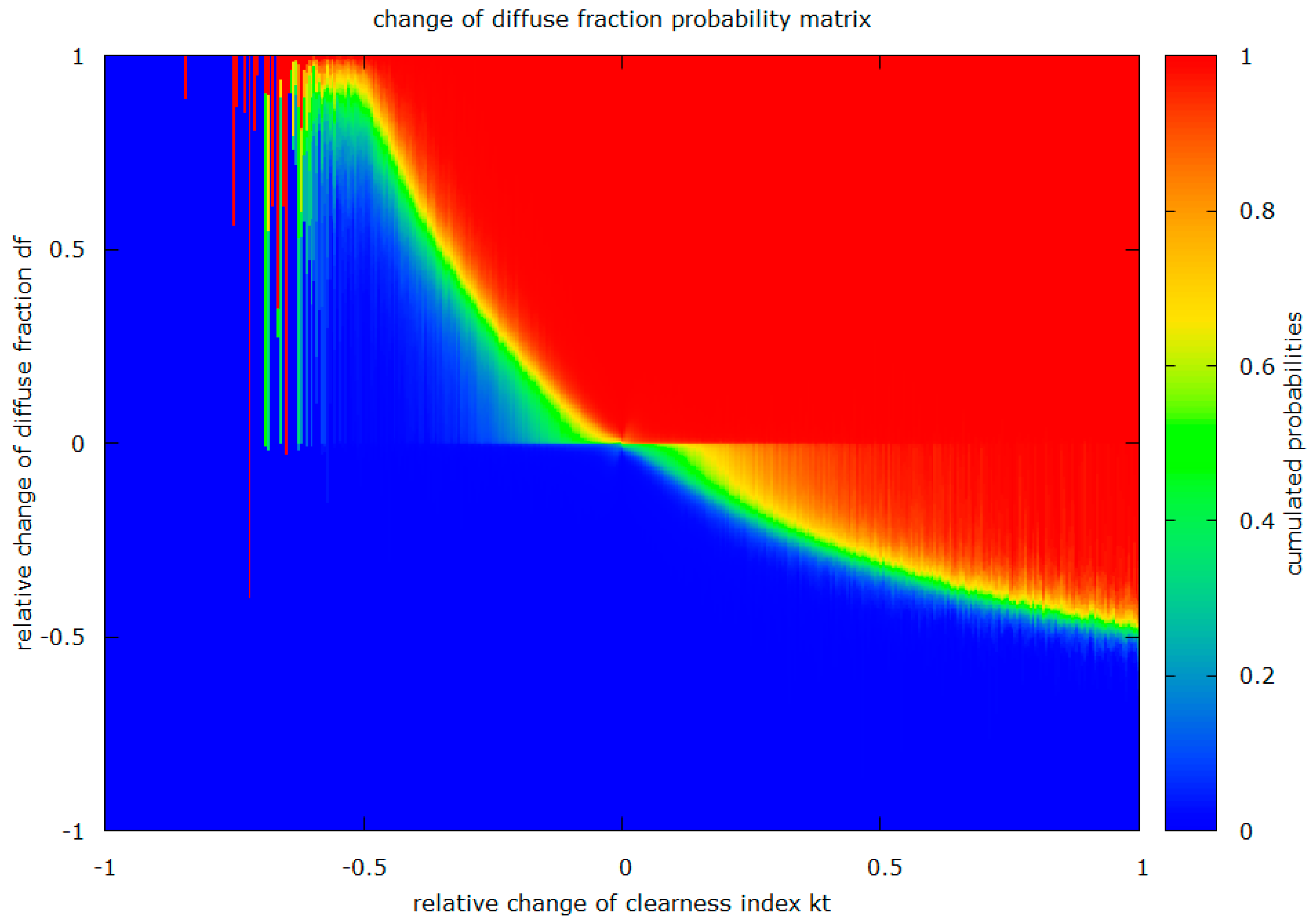 In correspondence to part 1, the relationship between the relative change of and the relative change of kt () is also expressed in a matrix of probabilities, displayed in Figure 6. This matrix is only used in the range of −0.5 to 1, since the amount of measurement values outside of this range is too small, which results in unwanted noise. The procedure to retrieve a value for the diffuse fraction in this part, , is as follows: