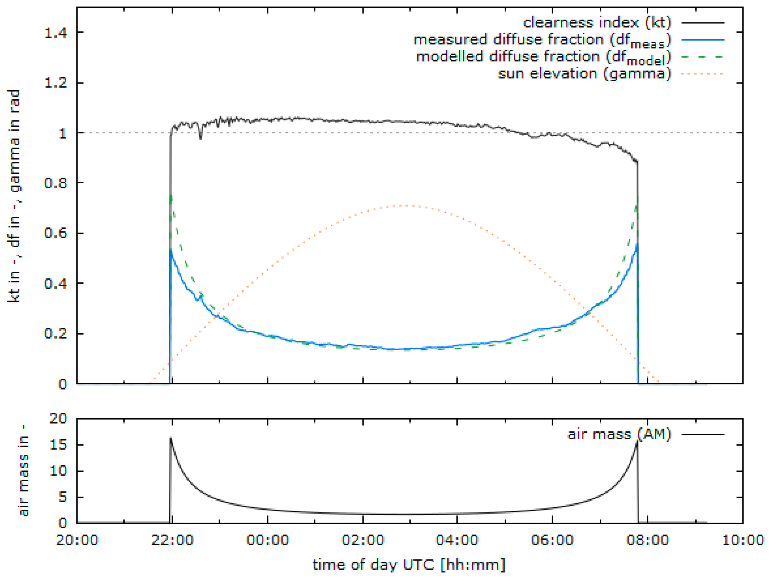 Figure 7 displays the measured (blue) and modelled (green dashed) course of the diffuse fraction over an exemplary day in Tateno, Japan (13 February 2006). While the clearness index (black) is relatively stable around 1, the diffuse fraction is around 0.5 shortly after sunrise and before sunset and is falling down to a minimal diffuse fraction at noon, to 0.136 in this example.