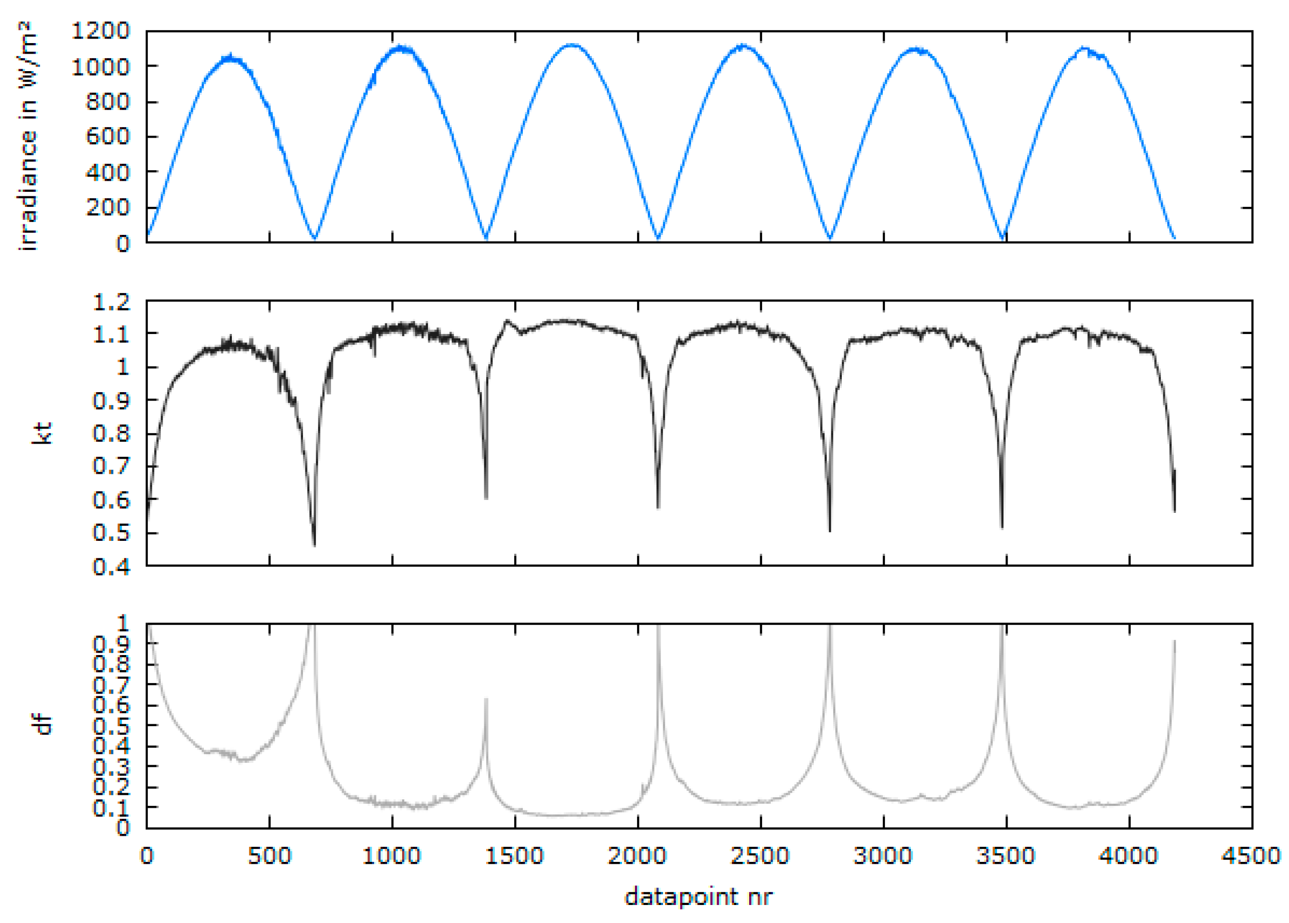 In order to illustrate the daily variation of , seven consecutive days in Tamanrasset, Algeria, are shown in Figure 8. Even for this non-cloudy site may vary significantly from day to day: The minimal value of the diffuse fraction (grey, bottom plot) of each day is varying between 0.328 on the first day (21 March 2006) and 0.062 on the third day (23 March 2006).