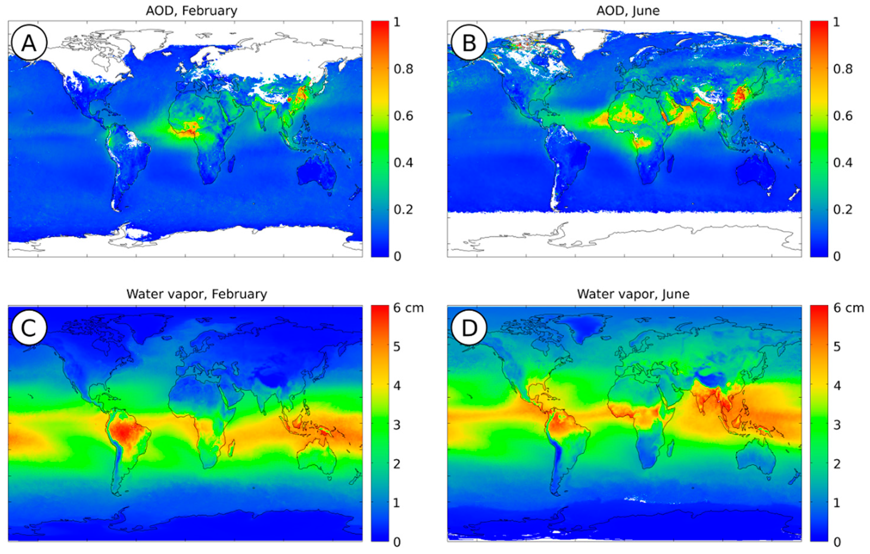 Figure 10. Monthly means of aerosol optical depth (AOD) (plots A and B) and water vapour (C,D) for February (A,C) and June (B,D), from 2001 to 2015. Data taken from NASA Terra/MODIS satellite [29,30]. - (5)