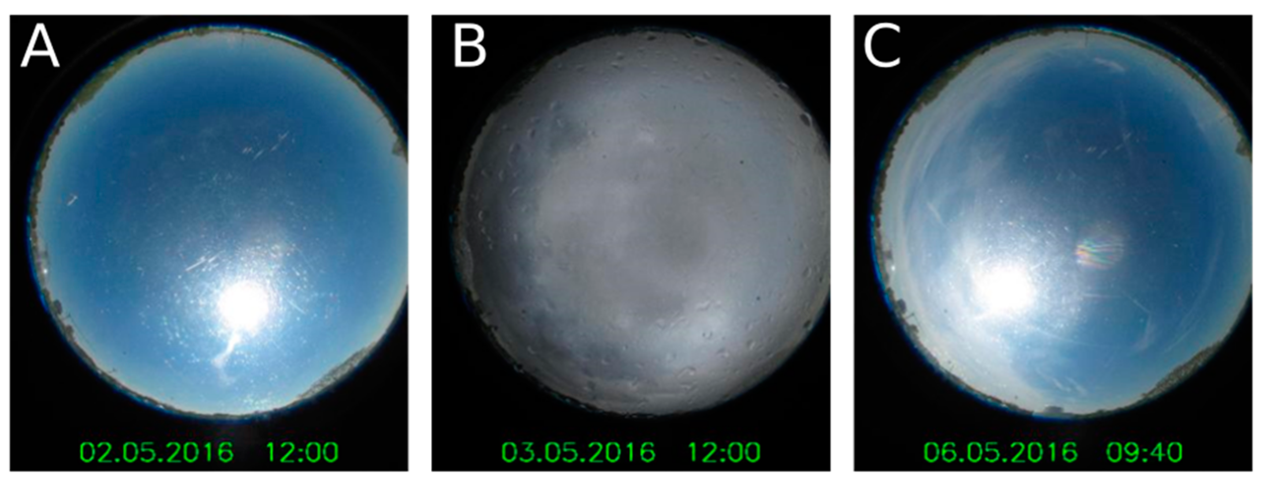 Three pictures made by an Hemispherical Sky Imager in Hannover (at the Institute for Meteorology and Climatology of the Leibniz University Hannover) in order to illustrate the three different weighing conditions presented in Table 7. Time in UTC. (A) 02 May 2016 12:00–Clear Sky: , ; (B) 03 May 2016 12:00–Standard: , ; (C) 06 May 2016 09:40–Transition: , .