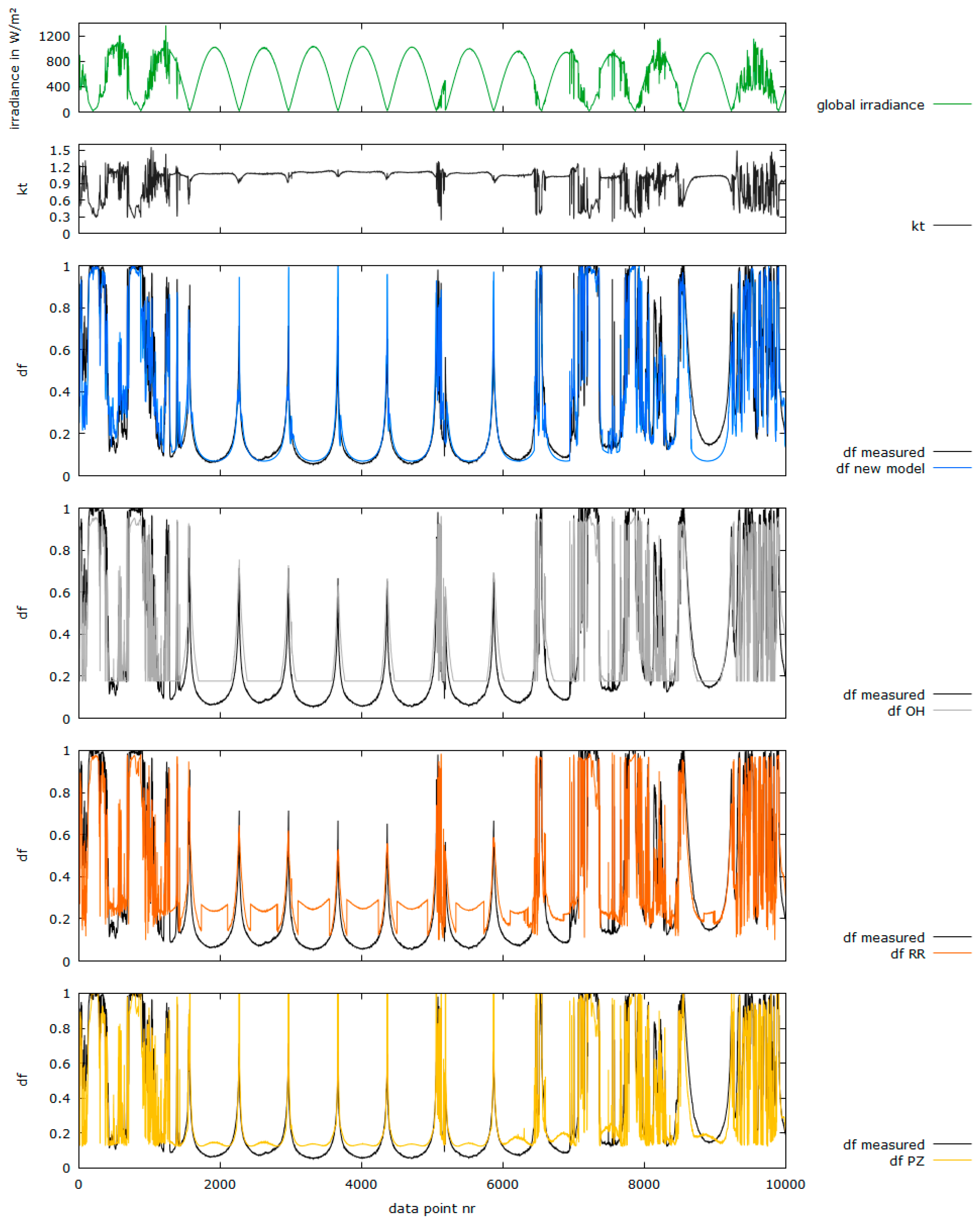Figure 12 displays two weeks in Alice Springs, Australia, 2005. The measured global horizontal irradiance is plotted on top (green); the resulting clearness index is plotted for reference underneath (black). In the three following plots, the measured diffuse fraction (black) is displayed, together with the diffuse fraction that was modelled with the new approach (blue), with the model from Orgill and Hollands [18] (grey) , the model from Reindl et al. [3] (orange) and the model from Perez and Ineichen [23].