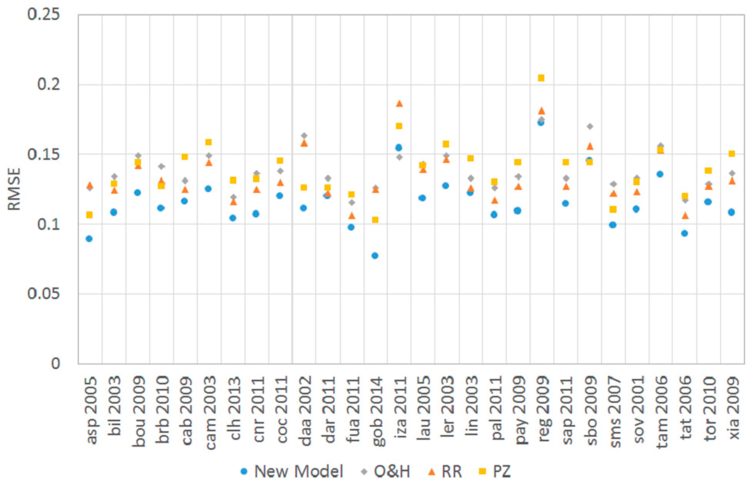 The root mean squared errors (RMSE) for all analysed datasets of the modelled versus the measured diffuse fraction. The RMSE of the new model is in all cases smaller than the RMSE of the model by Orgill and Hollands [18] (OH, grey), Reindl et al. [3] (RR, orange) or Perez and Ineichen [23] (PZ, yellow), except for the location of Izaña, Spain (iza 2011), where the OH model produces a slightly smaller RMSE. The mean RMSE over all test cases is at 0.116 for the new model, 0.138 for OH, 0.134 for RR and 0.139 for PZ, which implies an amelioration of the RMSE of 16%–20%.