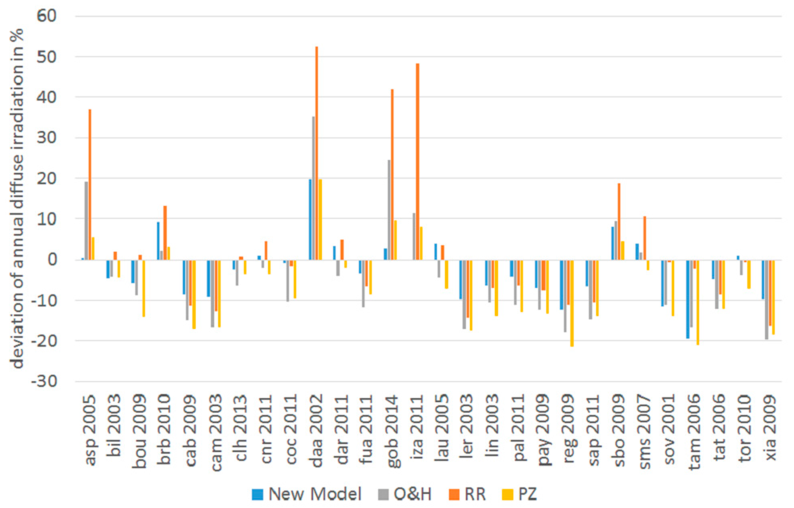 Relative deviation of the modelled annual diffuse irradiation from the measured diffuse irradiation for all analysed datasets. The new model performs better than the three reference models by Orgill and Hollands [18] (OH, grey), Reindl et al. [3] (RR, orange) and Perez and Ineichen [23] in nearly all cases, except for desert-like locations such as Solar Village, Saudi Arabia (sov) or Tamanrasset, Algeria (tam). None of the test cases shows deviations of more than ±20% for the new model. The mean absolute deviation over all test cases for the new model is 6.4%, whereas it reaches 11.9% for OH, 12.7% for RR and 10.9% for PZ. The mean absolute deviation can thus approximately be halved when using the new model.