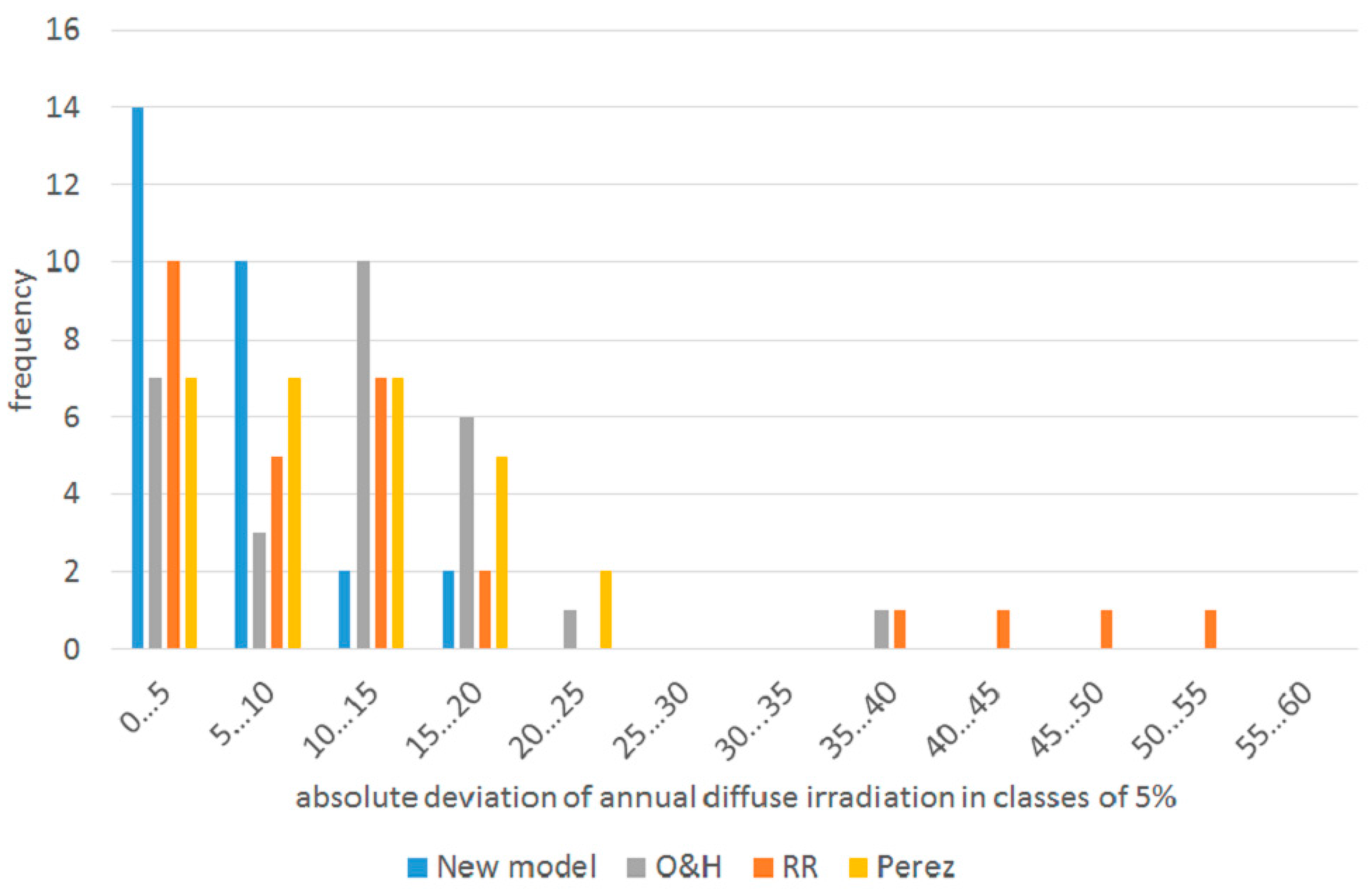 The histogram of the mean absolute deviations of the annual diffuse irradiation displayed in Figure 15 illustrates the frequency of the deviations each model produces. While the model of Reindl et al. [3] (RR) has its peak in the class of 0 to 5%, it still has several outliers of 35%–55%. The model of Orgill and Hollands [18] (OH) features only one extreme outlier at 35%–40%, but has most of its results lying in the class of 10 to 15%. The model by Perez and Ineichen [23] shows no outliers of more than 25% but has its results evenly distributed between 0 and 15%. The new model does not produce any outliers and has its peak in the class of 0%–5%, covering 50% of the test cases alone.