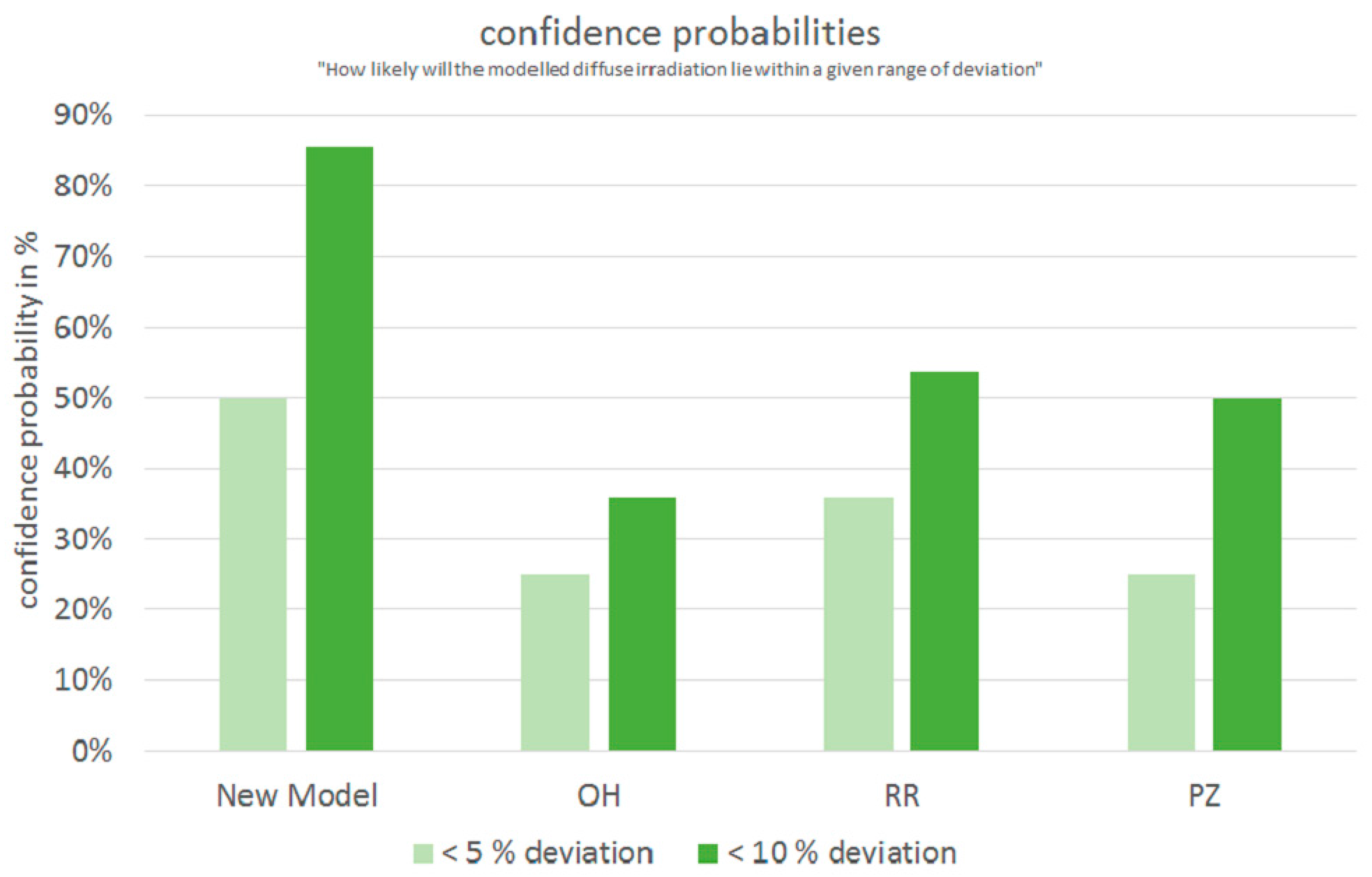 When using the new model for calculating the diffuse irradiance, the annual deviation of the modelled irradiation will be smaller than 5% in more than 40% of the cases, and smaller than 10% in over 80% of the cases. When using the model of Orgill and Hollands [18] (OH), these confidence probabilities reduce to 25% and 36%, while using the model of Reindl et al. [3] (RR) reduces the probabilities to 36% and 54% respectively. The use of the model of Perez and Ineichen [23] (PZ) results in probabilities of 25% and 50%.