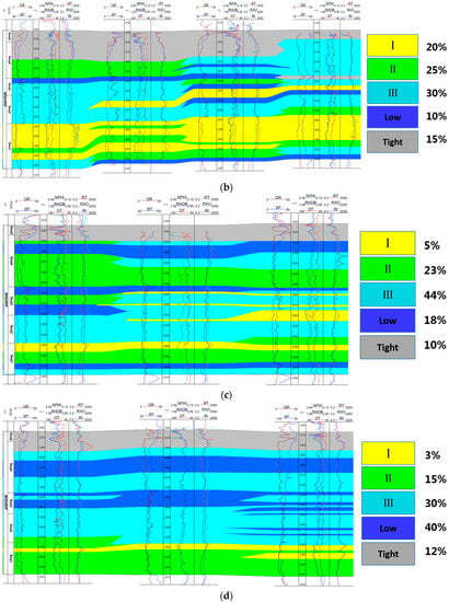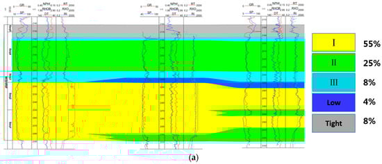 The oilfield studied in this paper is located in the north of the massif terrace of Arabia Peninsula. The geological strata is relatively stable, and there is almost no fault. The main rock lithology is carbonate and sandstone. Carbonate reservoirs usually have the characteristics of large lithologic variation, multiple reservoir types, and strong heterogeneity [14,15]. The oilfield studied in this paper is a typical carbonate reservoir with a heterogeneity of vertical permeability [16], and there is a great difference of geological structure and superimposed mode in different areas. According to the different values of permeability, we can divide formation into five types, which are tight type, low type, I type, II type, and III type. Furthermore the four superimposed modes were established in terms of the different ratios of permeability shown in Figure 1. The details of the parameters can be found in Table 1.