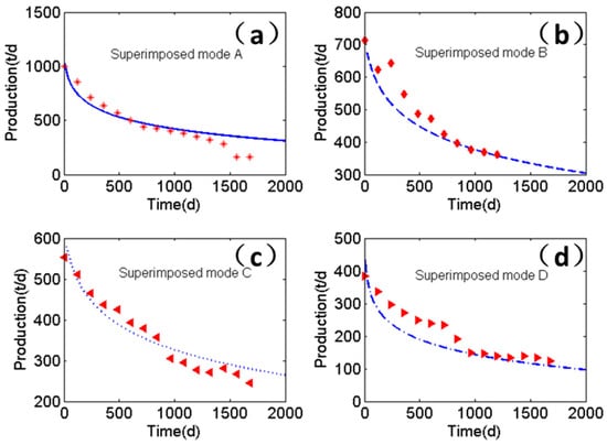 Comparison of actual production data and the present model with different superimposed modes: (a) superimposed mode A; (b) superimposed mode B; (c) superimposed mode C; (d) superimposed mode D.