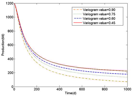 Figure 5 shows the relationship between production and time with different variogram values. Figure 5 shows that the larger the varigoram value, the stronger the heterogeneity of reservoirs, and the faster decline of production. The stronger heterogeneity of the reservoir would lead to a reduction of the formation pressure more quickly.