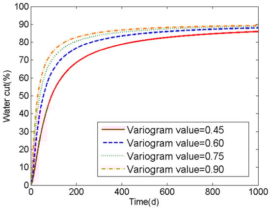 Figure 6 displays the relationship between the water cut and times with different variogram values. As shown in Figure 6, the water cut becomes larger with the increase in the variogram value. This means that the heterogeneity of the reservoir would be stronger with the increase of variogram value, which leads to faster water movement in high permeability layer than low permeability layer.