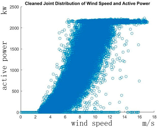 For cleaning process, a typical wind turbine power curve is adopted as a reference. After comparing the observed power curve to the reference, data points which contain negative values for power output are filtered out. Moreover, some bad data points caused by sensor mistakes are also cleaned. The wind turbine power curve from the cleaned dataset is shown in Figure 3.